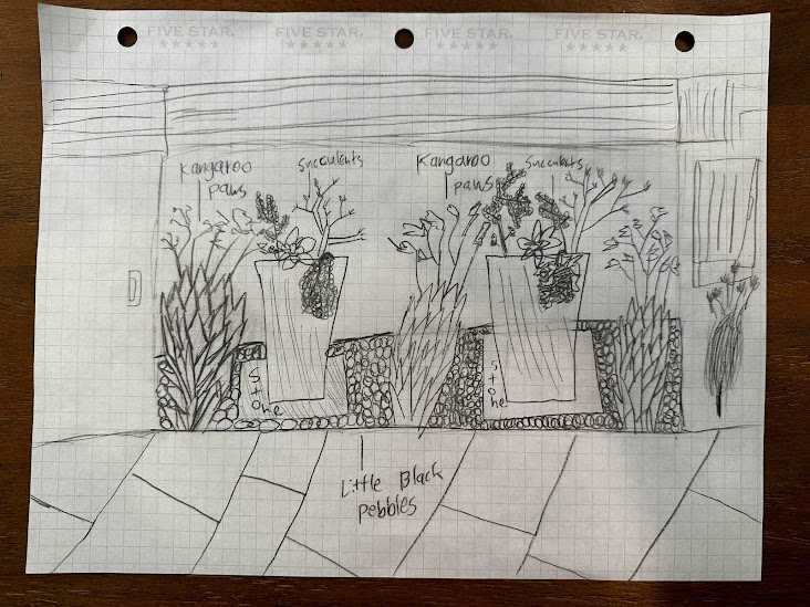 Here below is a paper I drew of an idea of what I wanted to landscape in the spot. It took me about 20 minutes to draw this drawing, which is not a long time.