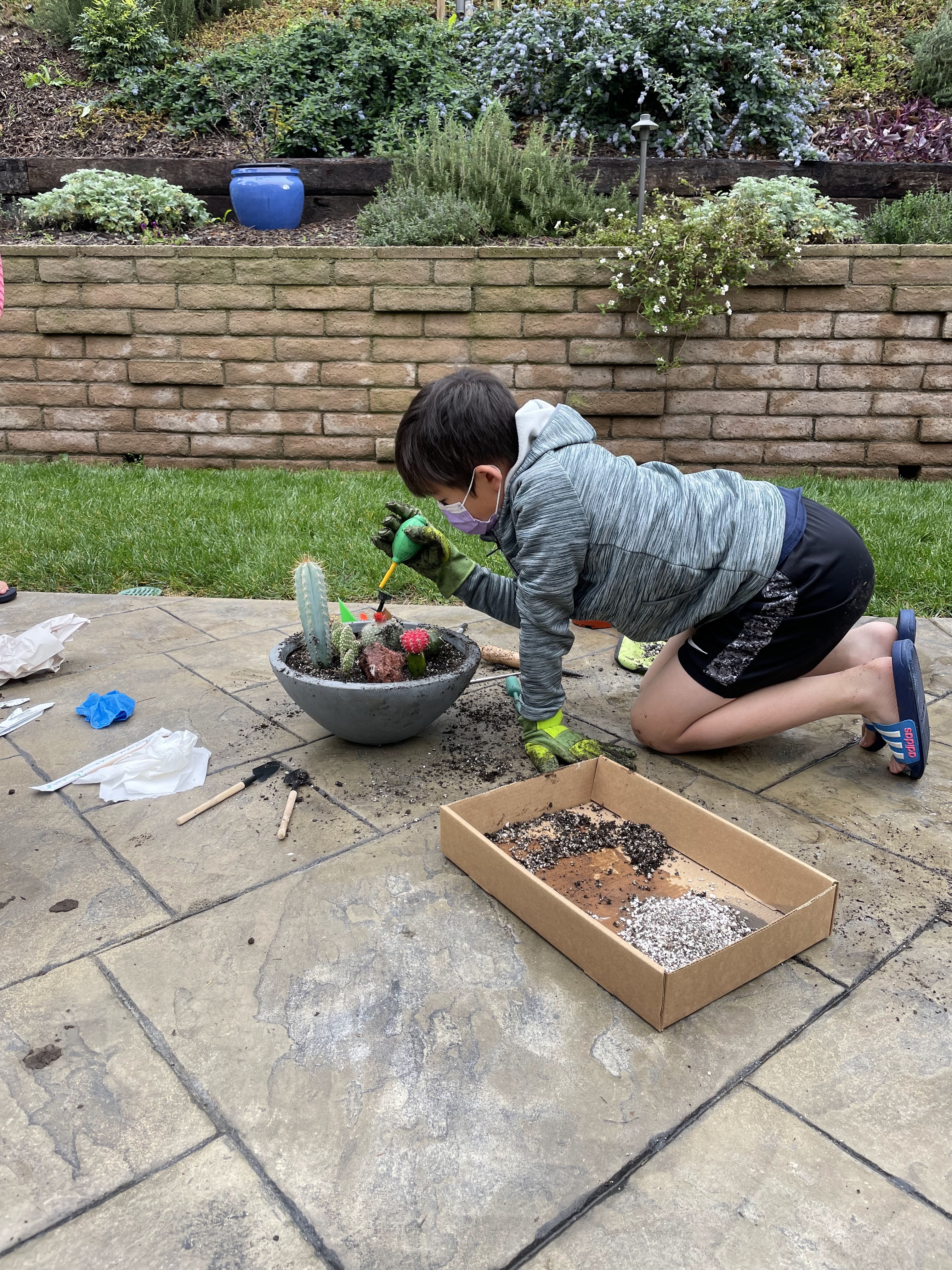 The whole arrangement ended up costing way more than $60. My mom said she would buy me the pot with her own money, and that cost $45. She also bought me the big brown rock for $5. But the cactuses and the little white and light colored rocks (top dressing) were all within my budget. Thankfully, I also had some tools that are good for cactuses. The most important tool when dealing with the sharp spines is some gardening gloves. I also had a little air puffer (see my photo below), brush, and tweezers. These are good to clean the dirt off the cactuses and that is between the spines.