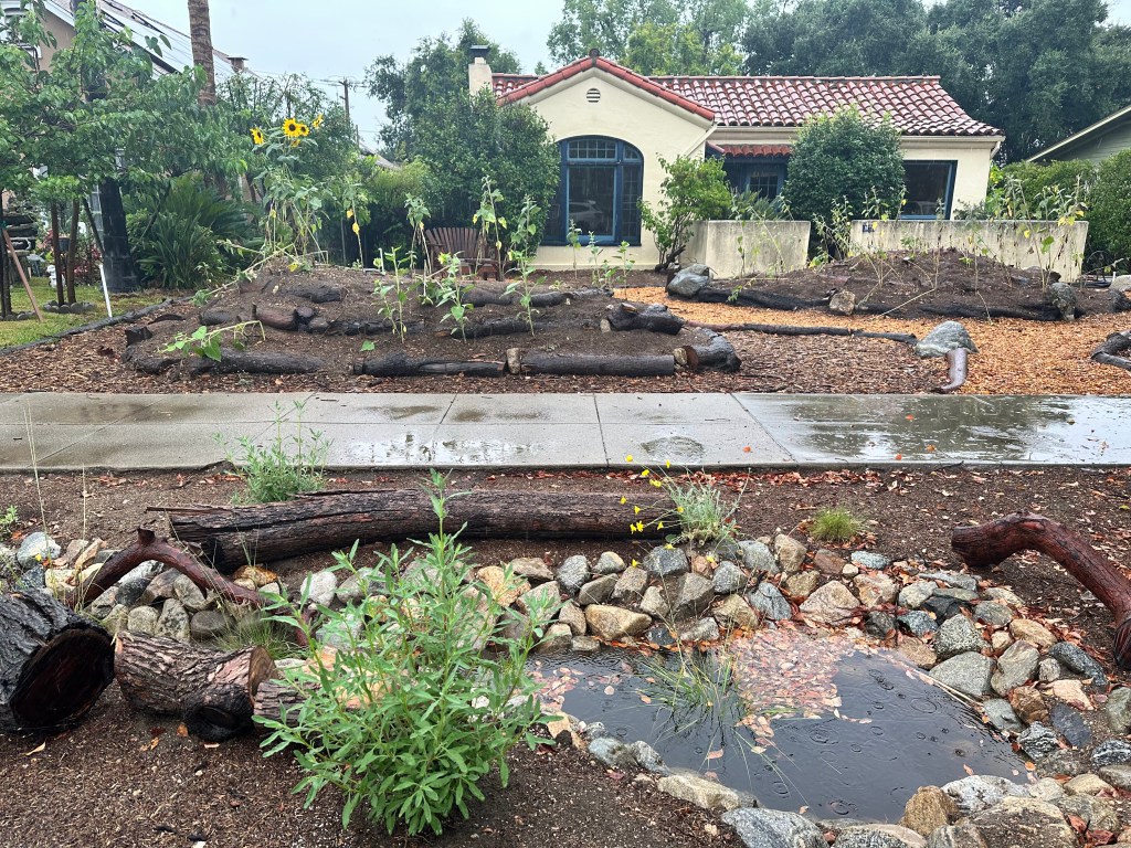 During Hurricane Hilary, we went to check on the hugelkulture work site to see how the rain goes from the sidewalk to the rain garden. The water was going through a hole in the side of the curb and was accumulating in the rain garden. The rain garden is basically a little pond. From the pond, the water will trickle down and water the rest of the yard because the house is on a slope. On the hugels, they planted sun flowers. It is so cool how everything works.